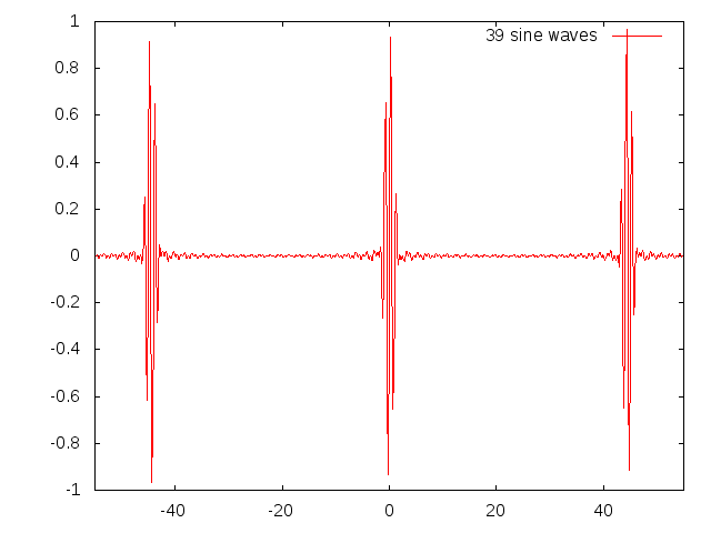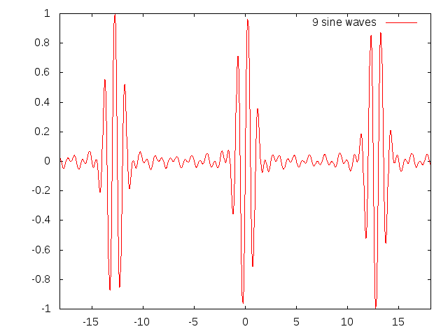 Now here is 9 sinewaves, 4 on either side of the central frequency. Observe the X scale: the beats are further apart: